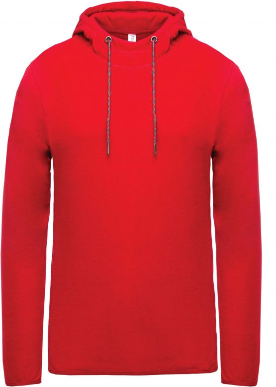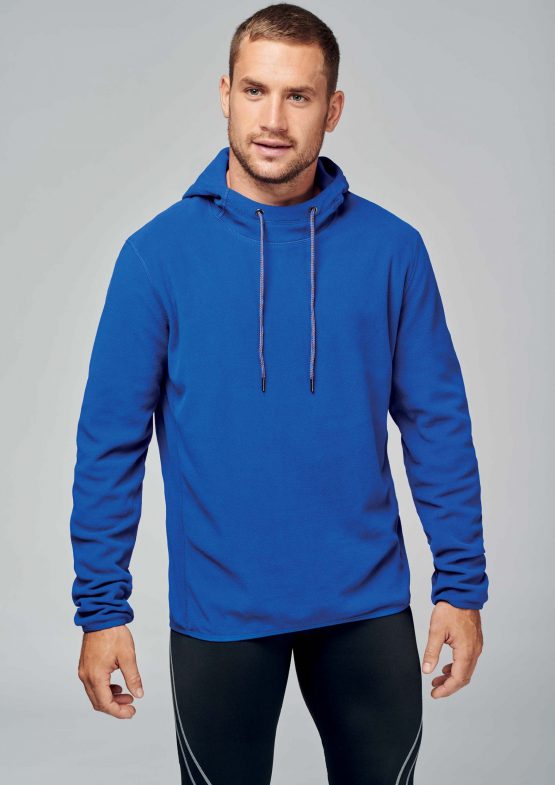 100% microfleece polyester. Comfortabele snit met inzetstukken aan de zijkant. Capuchon ontmoette tweekleurige aanrijgkoordjes. Elastische ton-sur-ton bies aan mouwuiteinden en onderkant.