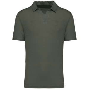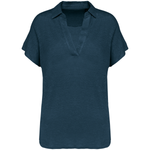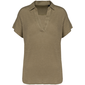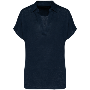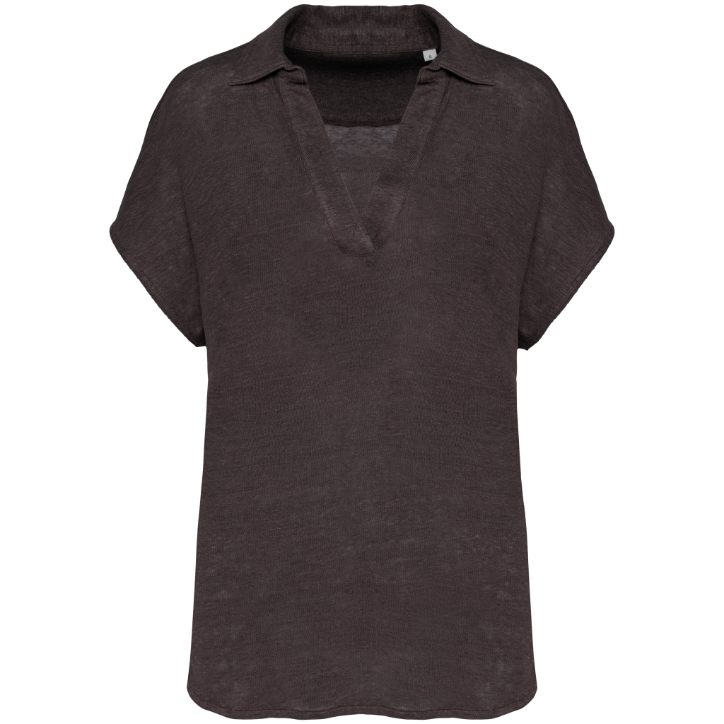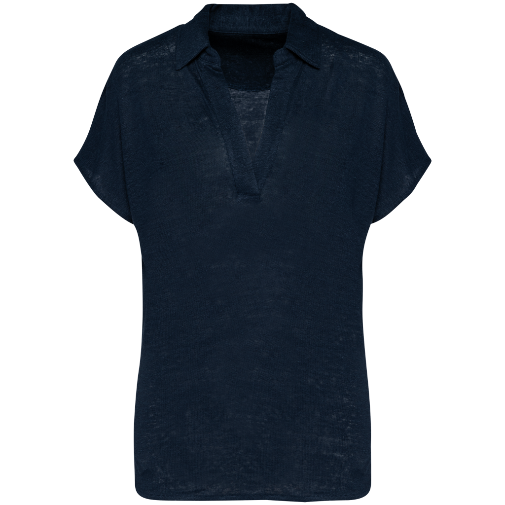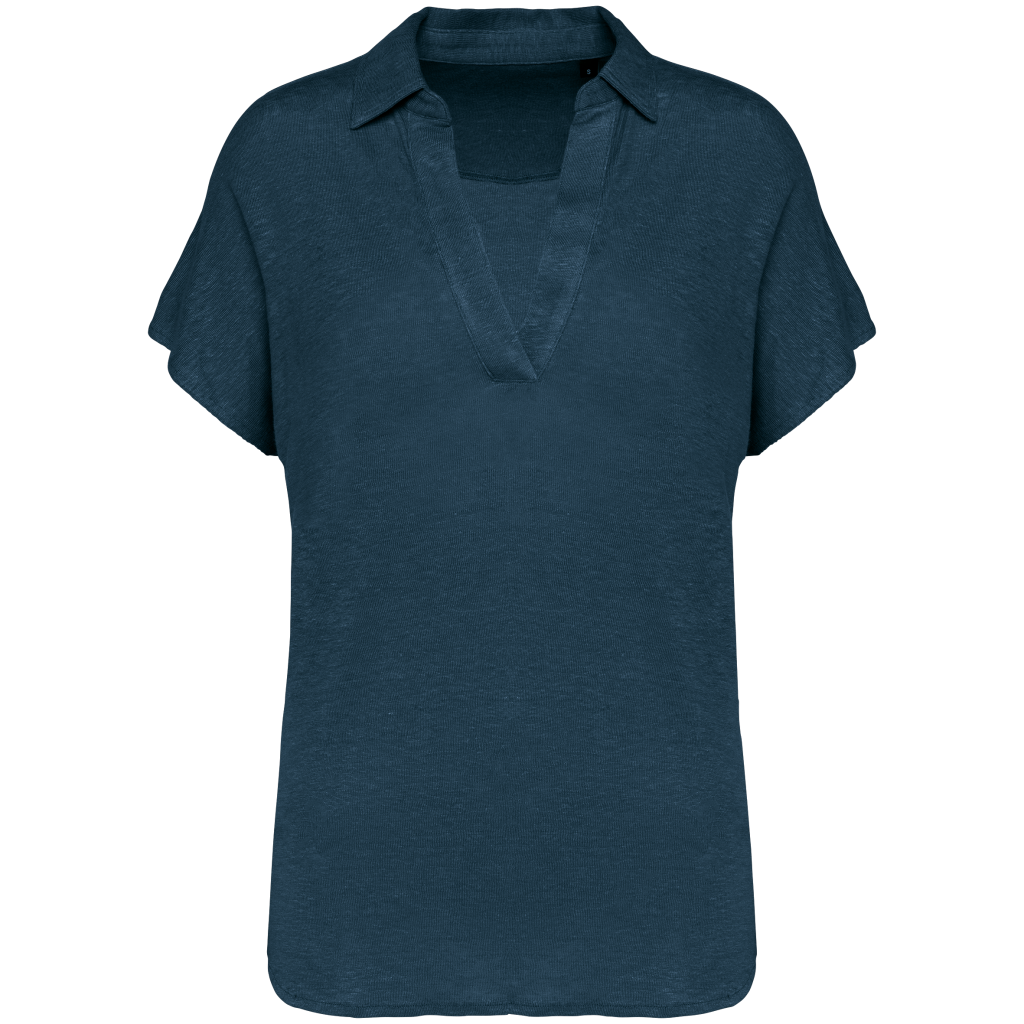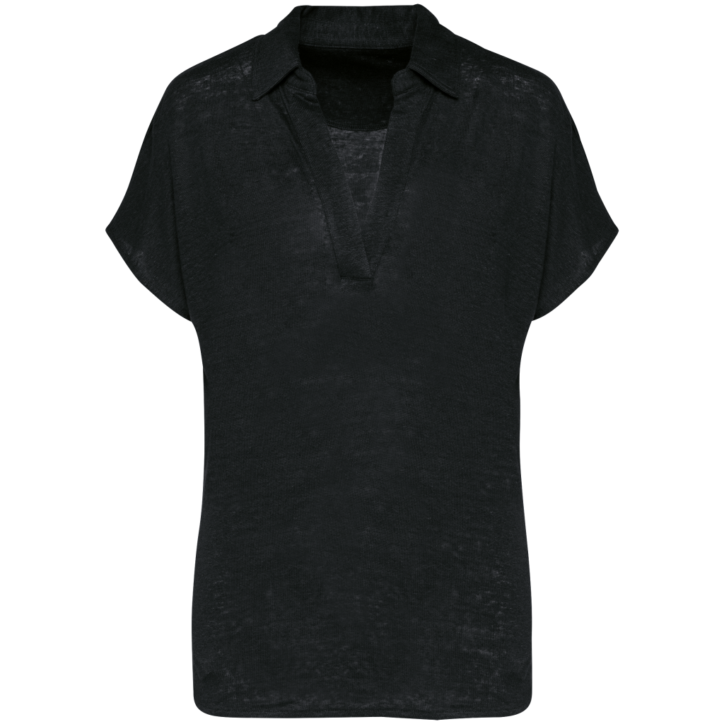 100 % Linnen. Tricot. Regular fit met afhangende mouwen. Zijsplitten met een driehoekje. Polokraag met staander en V-hals met knooplijst zonder knoop in de hoofdstof. Dubbel stiksel aan de mouwboorden en de zoom. Halvemaan op de achterkant.